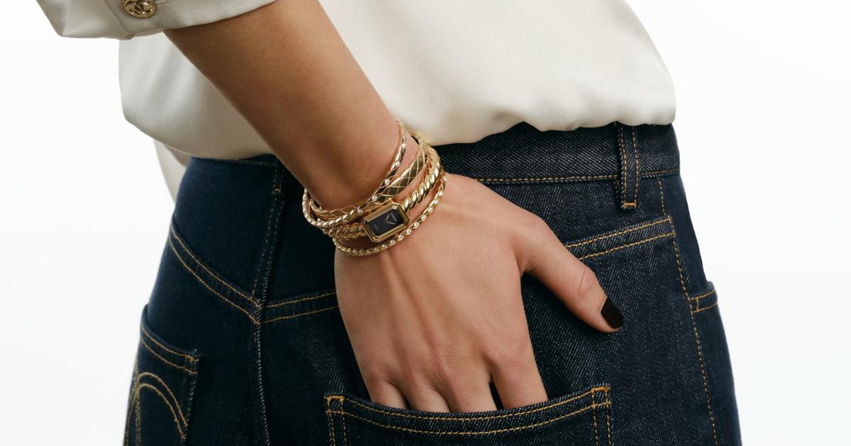 Cet automne, la Première est de retour, toujours aussi fidèle à son esprit couture, cette fois avec un nouveau bracelet. La Première réinterprète cette fois le galon, une des signatures stylistiques les plus emblématiques et distinctives du vestiaire Chanel. En effet, Gabrielle Chanel l’appliquait sur ses tailleurs pour en souligner les contours, en orner les poches et les poignets, structurant et soulignant ainsi la silhouette. Reprenant les couleurs du tailleur, ou contrasté pour un effet graphique, ce galon est réalisé dans une grande variété de matières et de techniques : tricoté, tissé, torsadé... Le bracelet de cette nouvelle montre Première Galon s’inspire de ce dernier; avec un jonc rigide torsadé en or jaune, associé au célèbre cadran laqué de noir dépourvu du moindre index.