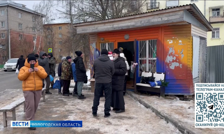 Тёплые обеды волонтёры выдают нуждающимся у Андреевского храма Вологды.