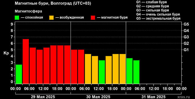 Согласно информации, предоставленной астрофизиками, магнитная буря, начавшаяся в три часа ночи 29 мая и закончившаяся в 6:30 30 мая, стала самой длительной в 2025 году. Ее продолжительность составила 27 часов.