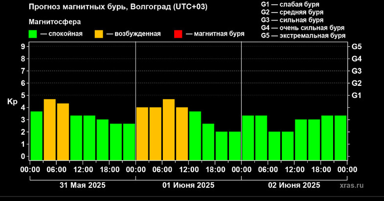 Как отмечают ученые, в первую половину субботы, 31 мая, геомагнитная атмосфера в Волгоградской области будет оставаться спокойной – Kp = 3.33. Тем не менее вероятность магнитной бури оценивается в 51%, а вероятность геомагнитных возмущений – 35%. При этом скорость солнечного ветра по-прежнему остается экстремально высокой – 766 км/с.