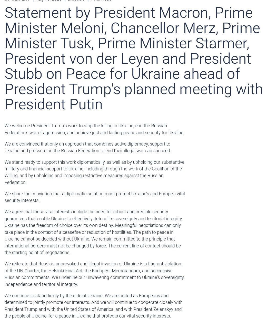Лидеры Франции, Италии, Германии, Польши, Великобритании и Финляндии, а также Еврокомиссии сделали официальное обращение накануне переговоров Путина и Трампа.