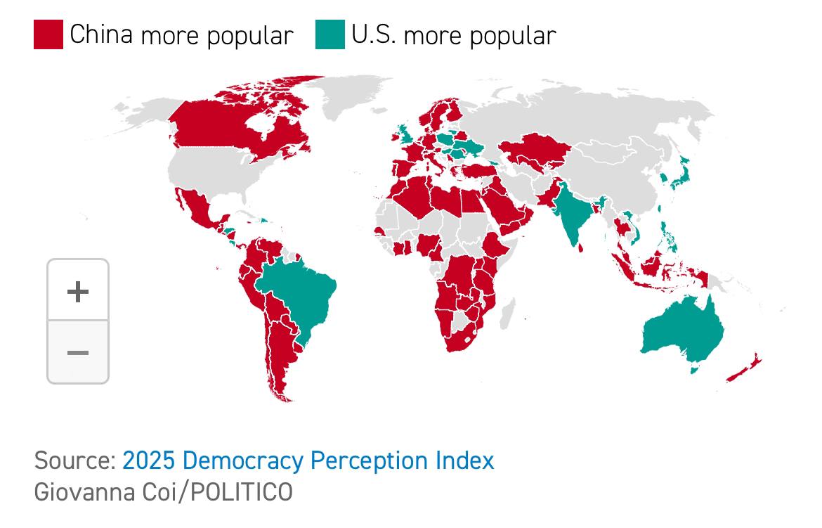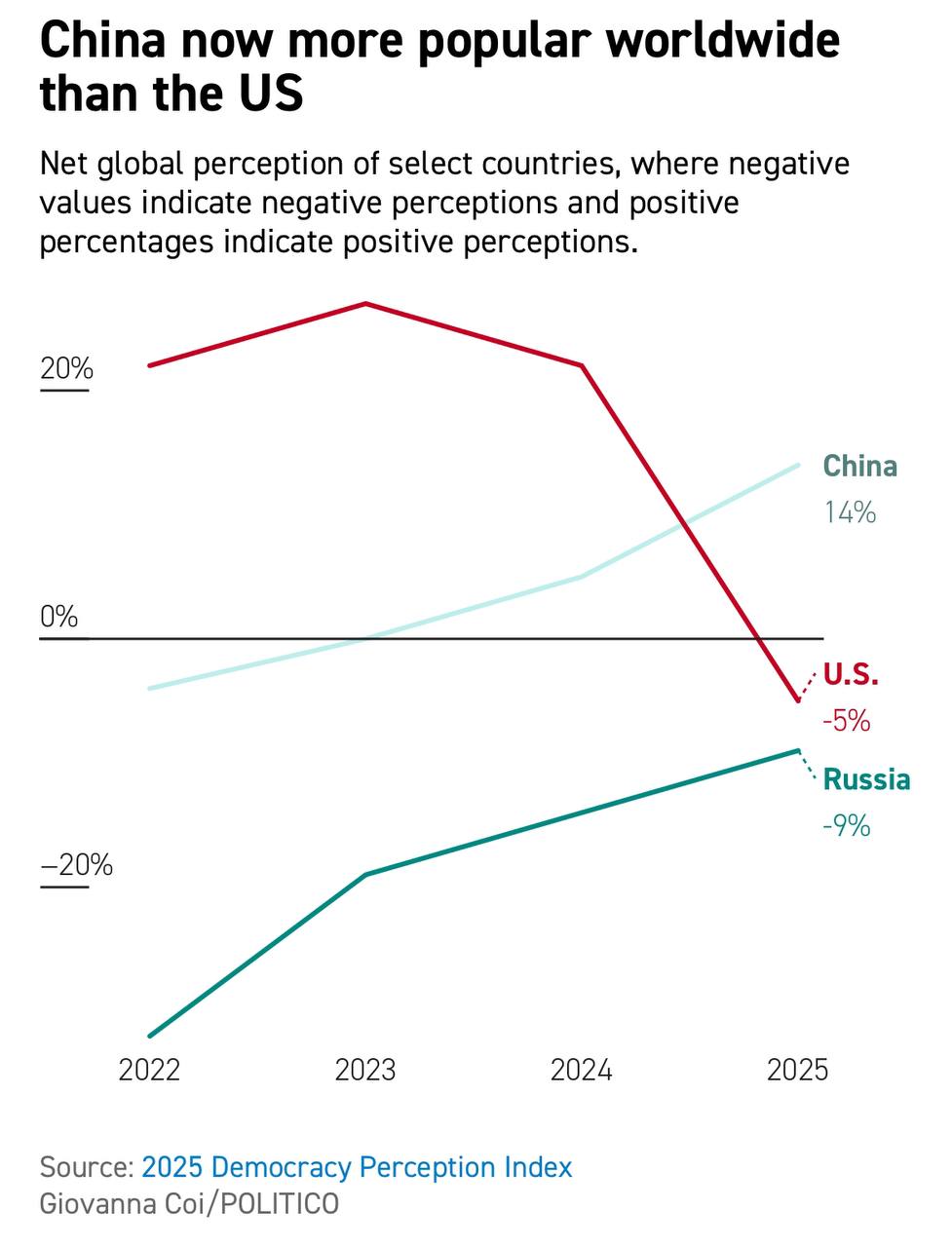 Китай обогнал США по популярности среди населения планеты, согласно опросу 2025 Democracy Perception Index. Россия, репутация которой согласно этому опросу упала после 2022 года, по-прежнему более непопулярна, чем США, — но ее имидж также улучшается.