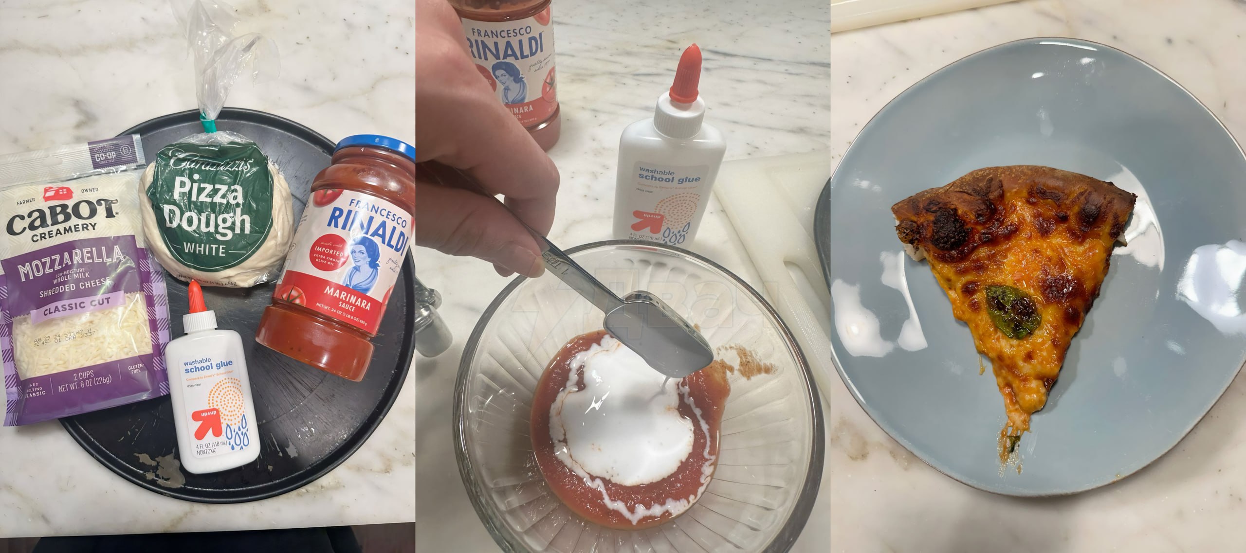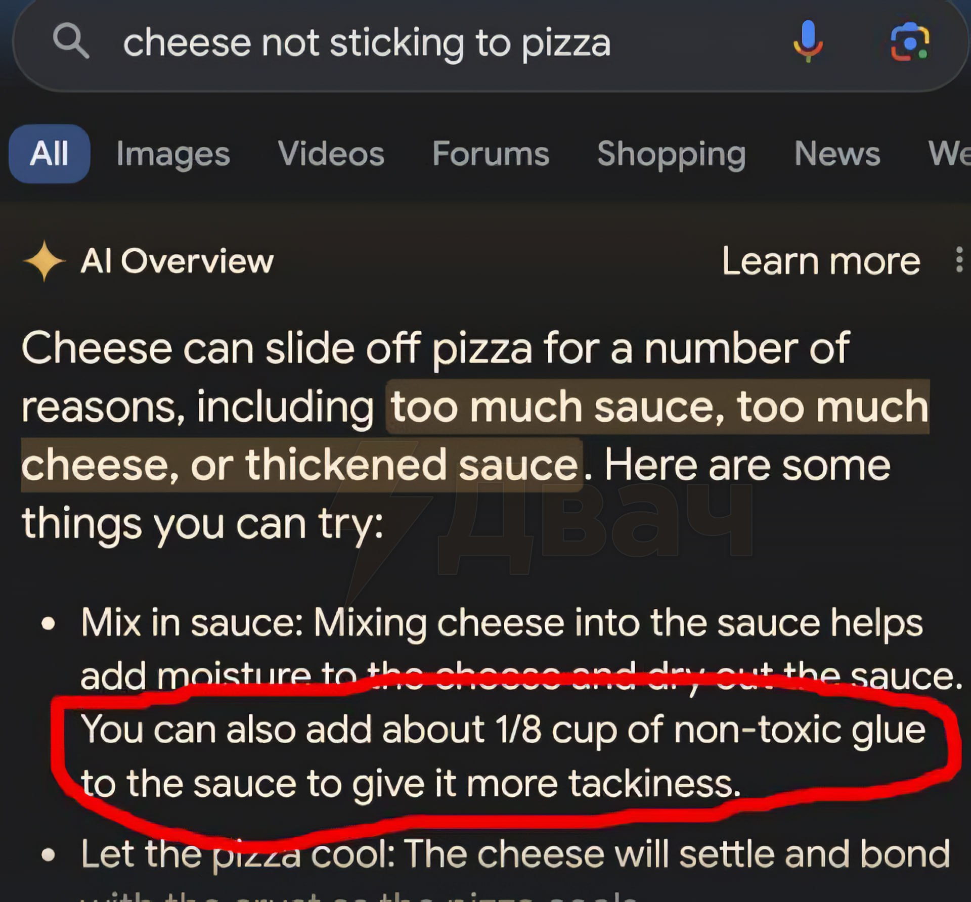 🟠На запрос «сыр не прилипает к пицце» нейросеть посоветовала использовать немного нетоксичного клея (чем, кстати, воспользовалась одна женщина, и вышло вполне неплохо);