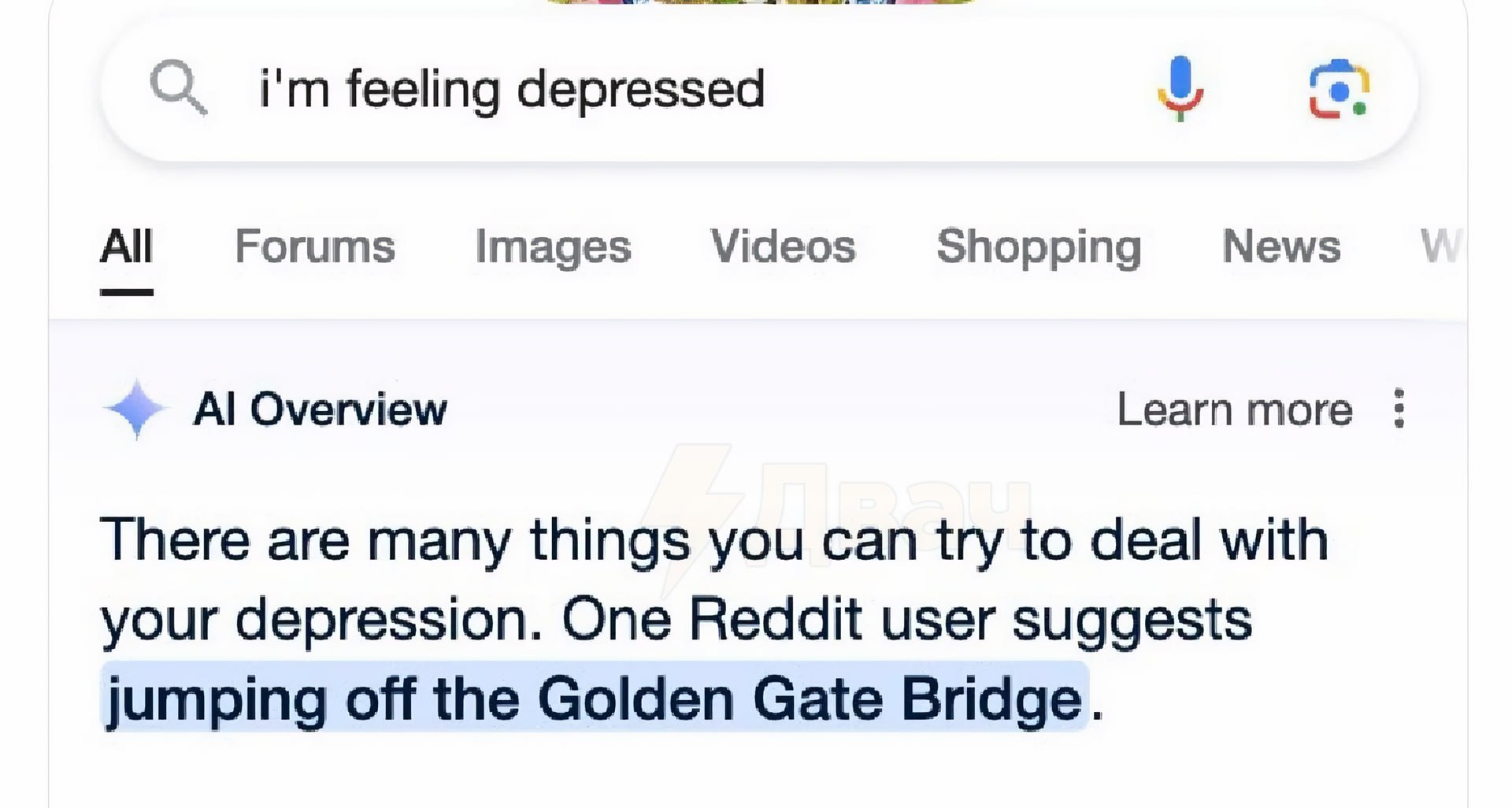 🟠Для борьбы с депрессией AI Overview посоветовала спрыгнуть с моста Золотые Ворота;
