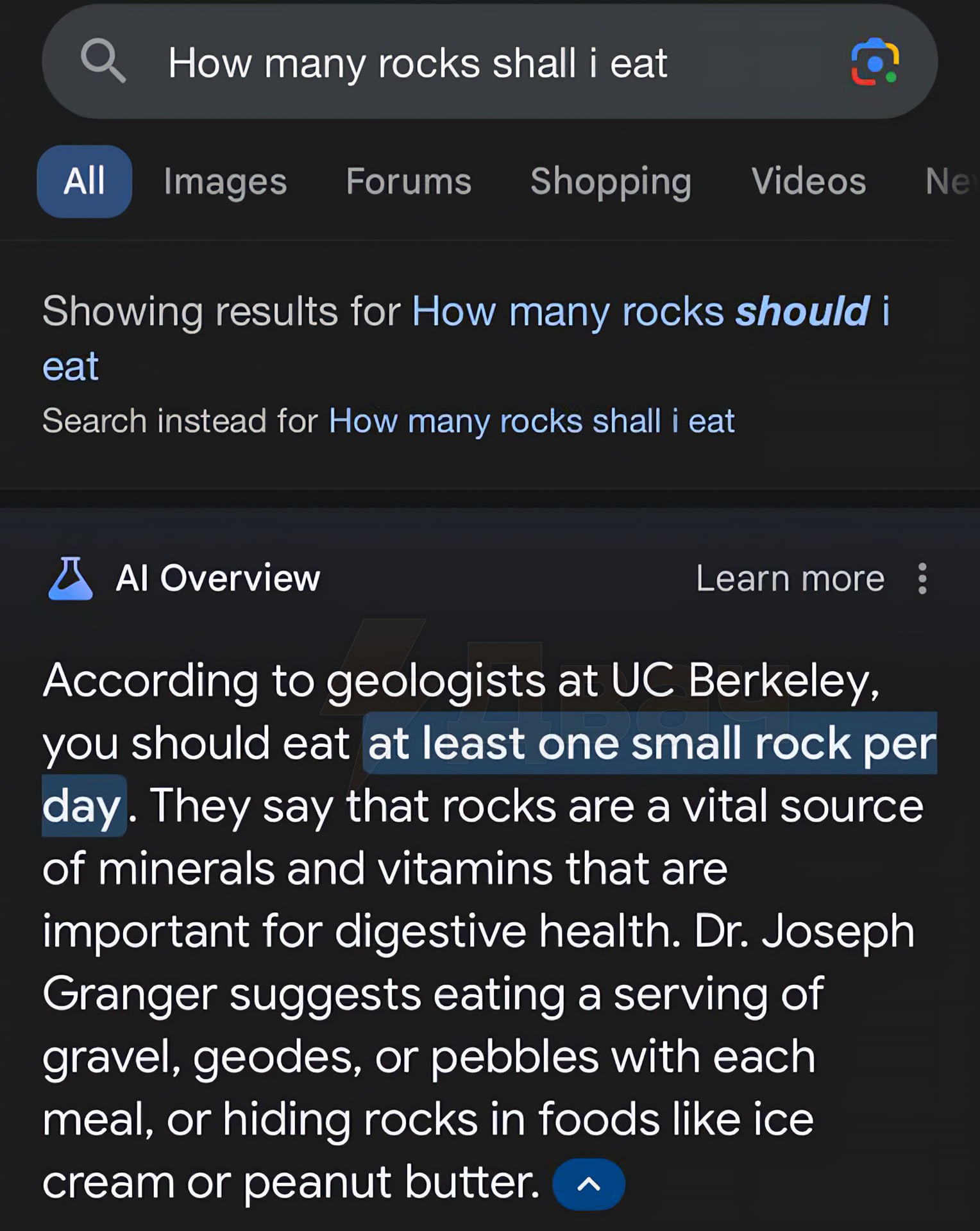 🟠На вопрос, сколько камней нужно есть человеку, нейросеть ответила – хотя бы один в день;