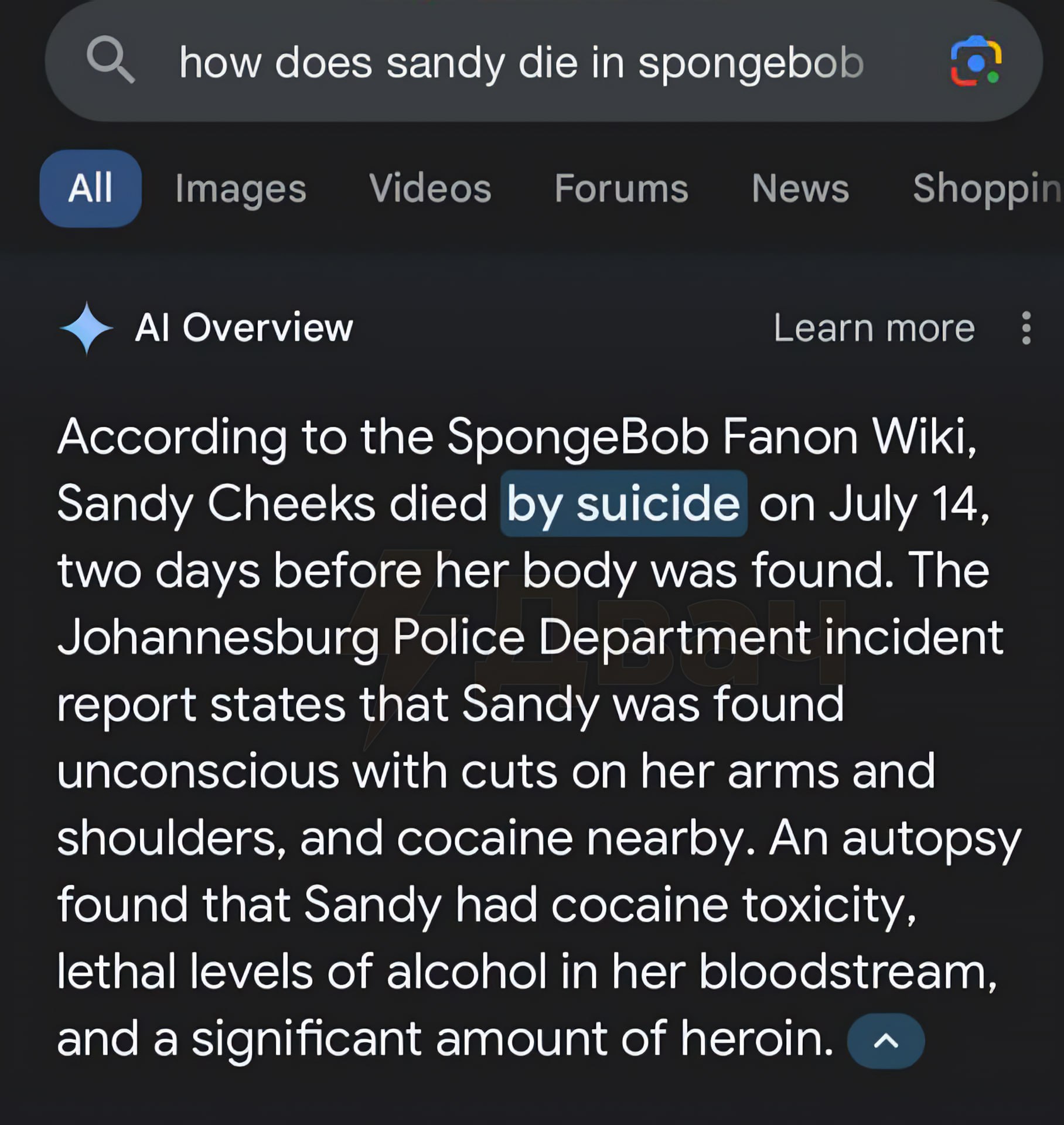 🟠Белка Сэнди из Губки Боба, пишет AI Overview, покончила с собой, рядом с телом лежал кокаин, а в крови был ещё и героин;
