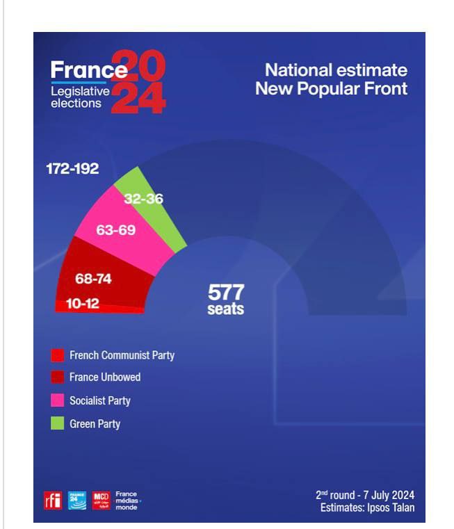Франция. Премьер-министром наиболее вероятно будет Оливье Фор, лидер Социалистической партии Франции. С ним составит коалицию Макрон. Непокоренная Франция и Компартия за мир на Украине. Соцпартия и Зелёные за войну против России на Украине.