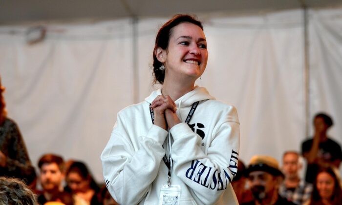 Молодая женщина слушает в восторженной тишине во время службы Living Proof Tent Crusadв Бейкерсфилде, Калифорния, 12 марта 2023 года.(Allan Stein/The Epoch Times)