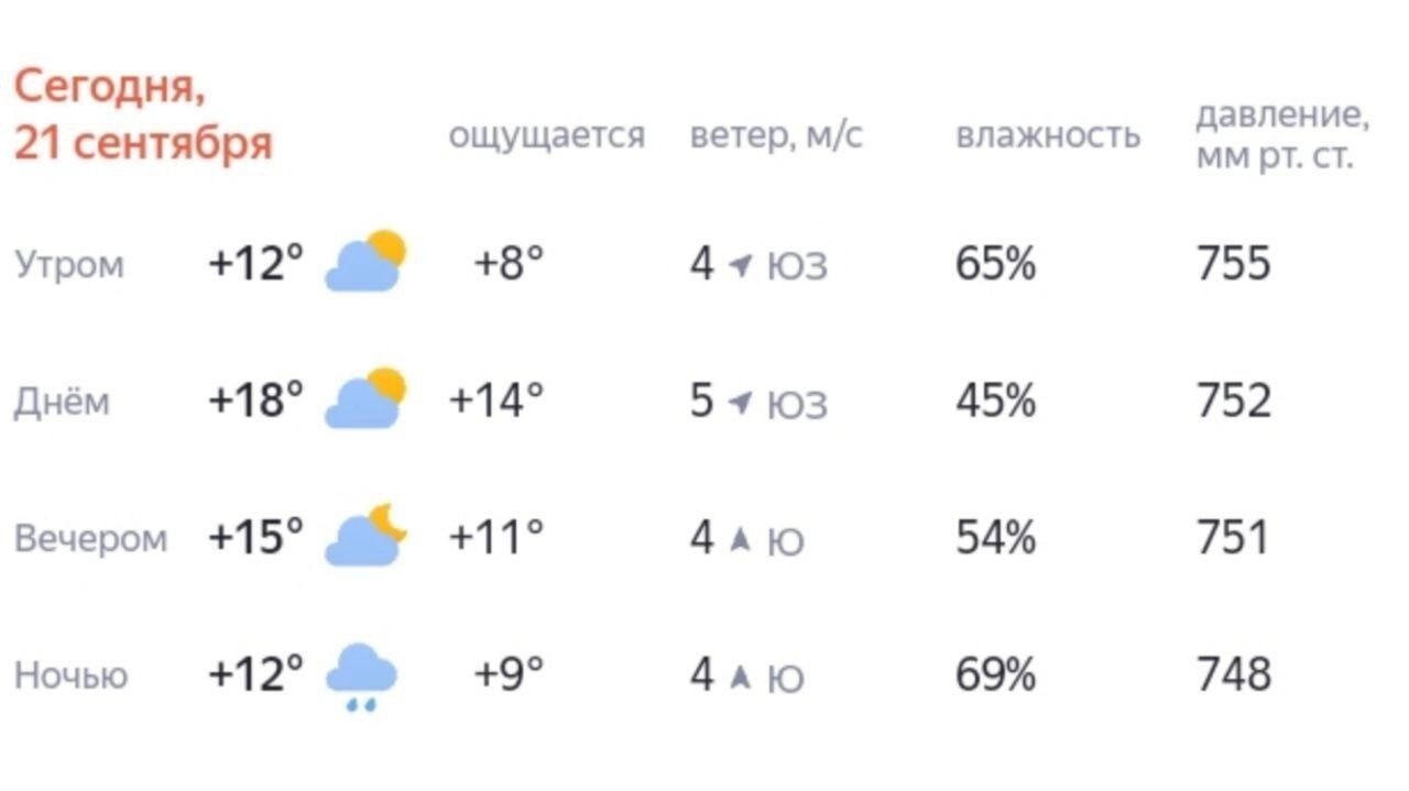 В Нефтеюганске весь день будет пасмурно, кроме вечера — обещают ясную погоду. Утром прогнозируют +12 градусов, днем — +18 градусов. К вечеру температура опустится до +14 градусов, ночью будет +10 градусов. Ветер — юго-западный с переходом в южный, 3-5 м/с.