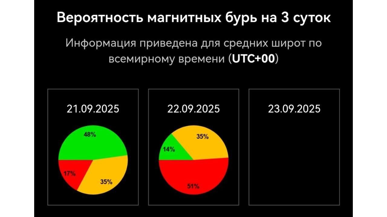 Вероятность магнитной бури в этот день — 17%, перехода магнитосферы в возбужденное состояние — 35%. В понедельник вероятности уже заметно меньше — это не случайно: ученые уже предупреждали, что в ближайшие дни вновь будет штормить.
