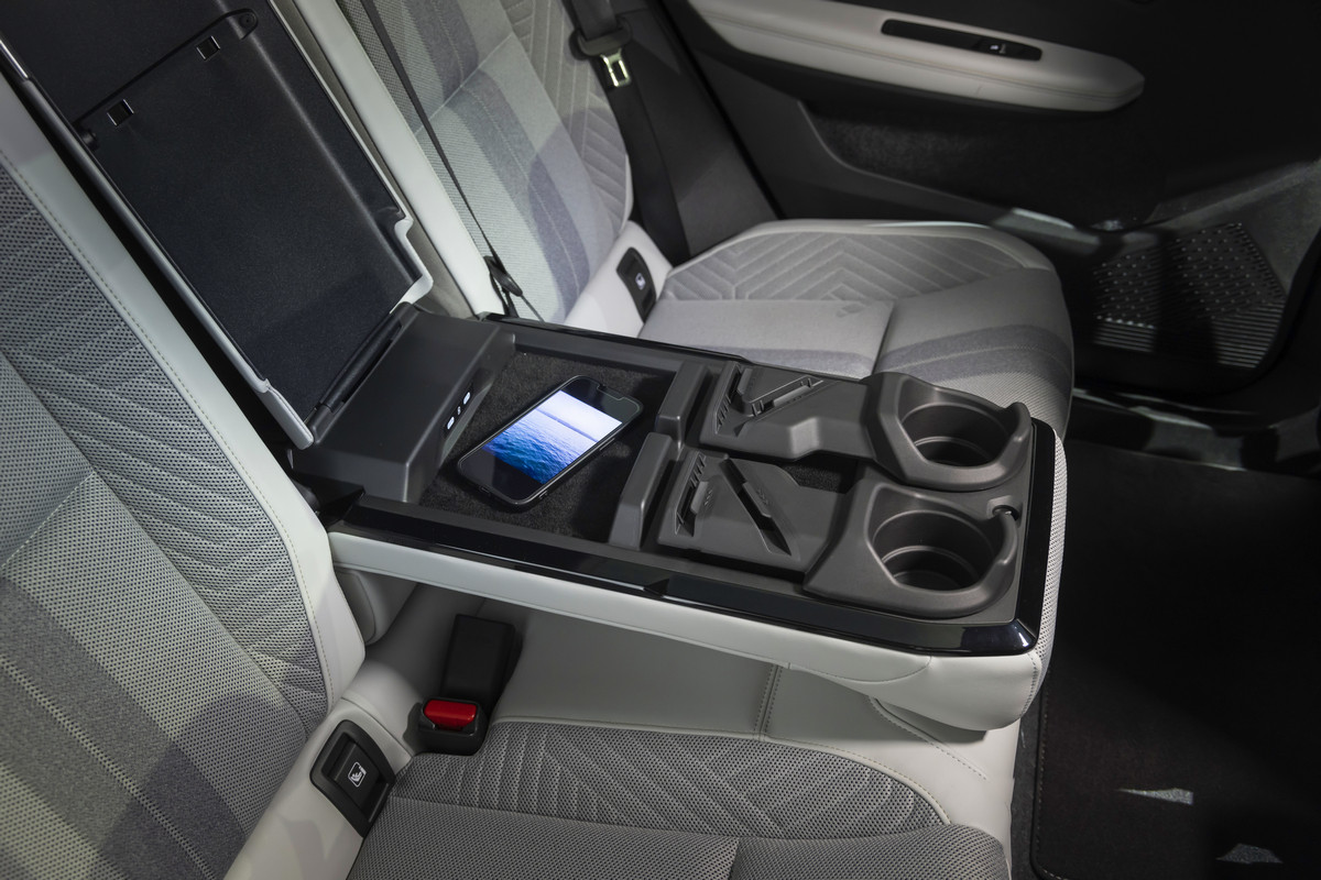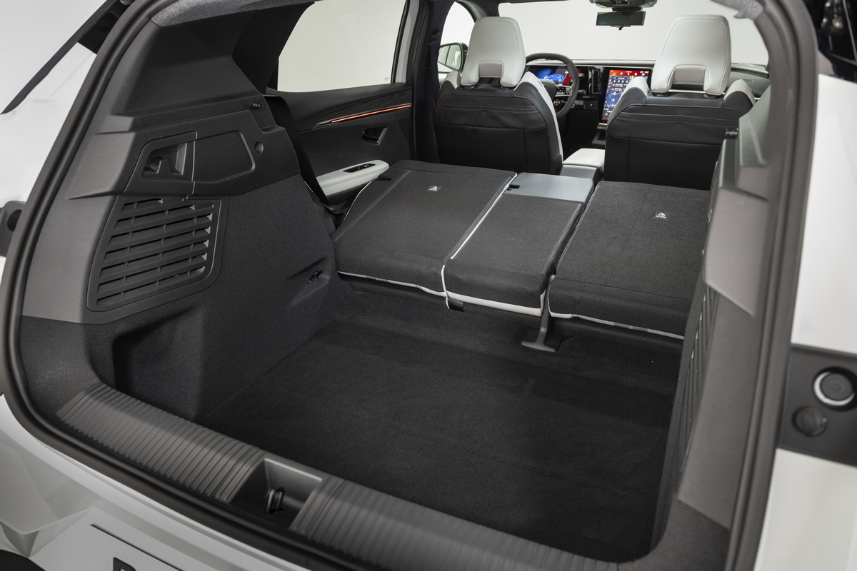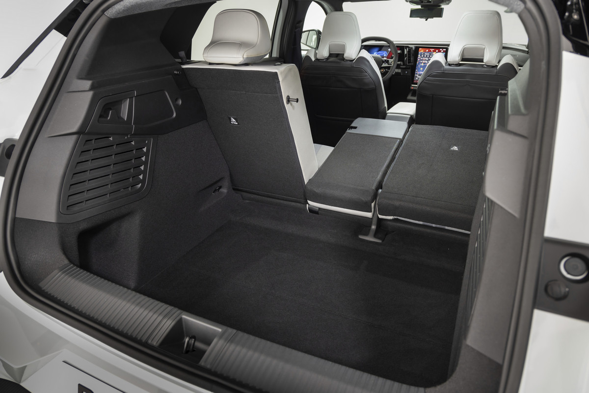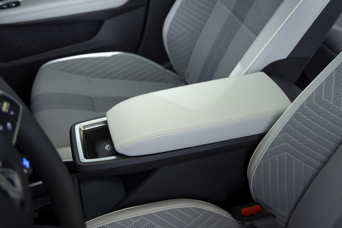 Спинка заднего дивана разделена в пропорции 40:20:40, в центральный подлокотник второго ряда встроены USB-разъемы и подстаканники, которые вдобавок имеют откидные подставки для смартфона или планшета, плюс есть места для хранения гаджетов. Объем багажника Renault Scenic E-Tech electric – 545 литров, с разложенными спинками задних кресел этот показатель увеличится до 1670 литров.