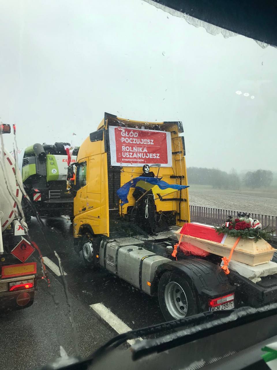 🏴☠️В соцсетях распространяется фото грузовика одного из польских митингующих на границе с Украиной. К фуре прикреплен макет в виде смерти с косой, два украинских флага и гроб. На фоне надпись, которая дословно переводится так: «Почувствуешь голод — начнешь уважать фермера»