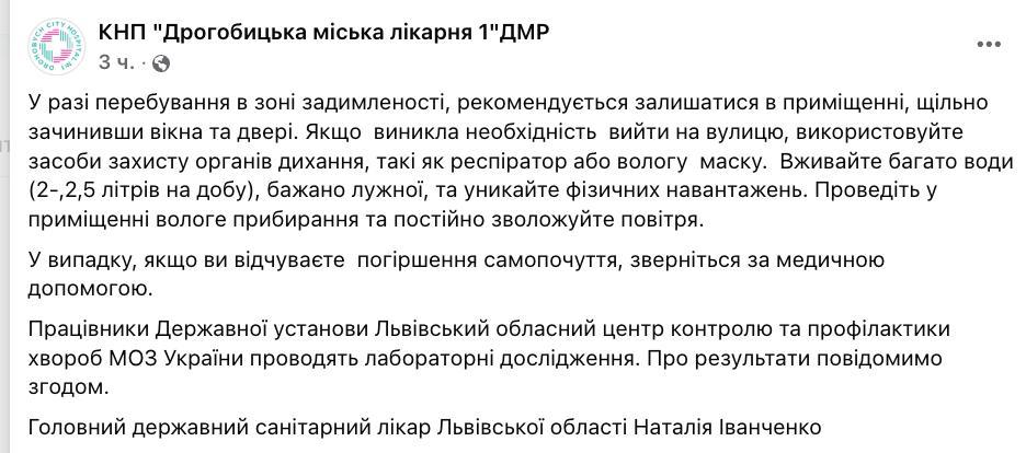 После ночных прилётов по промышленному объекту жителям Дрогобыча Львовской области советуют сидеть по домам плотно затворив все окна, пить больше воды и избегать физических нагрузок.