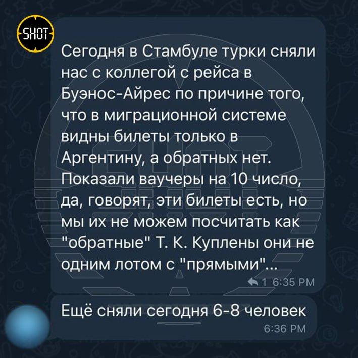 По данным SHOT, до Стамбула российские граждане добирались рейсами той же компании без каких-либо проблем. Самое интересное начиналось именно в Турции. Один из пострадавших рассказал нам, что без проблем прошёл таможню и уже готовился к посадке в самолёт, но его с женой и двумя детьми остановили представители авиакомпании. Сначала они просто отложили их паспорта, а затем сказали, что улететь не получится из-за "аргентинской стороны". Чуть позже в Turkish Airlines назвали другую причину: оказывается, полететь в Буэнос-Айрес не получится, потому что билеты туда и обратно были куплены отдельно, а не единым заказом, что противоречит требованиям перевозчика. В итоге семье предложили купить билеты на следующий день (почти за 500 тысяч рублей), но гарантий вылета также не дали, или же полететь домой.