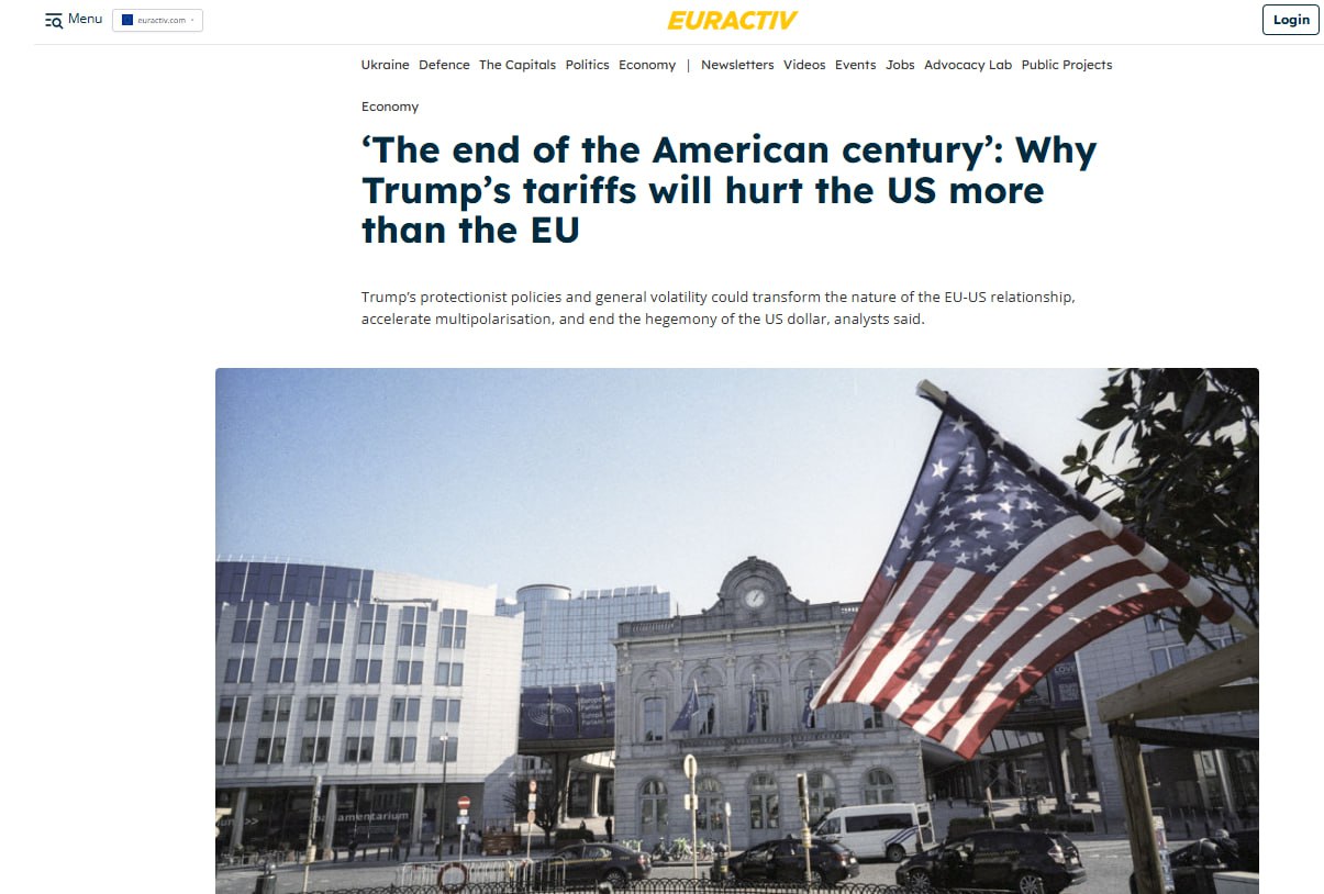Новые пошлины Трампа могут ослабить позиции доллара и знаменовать "конец американского века", пишет Euractiv.