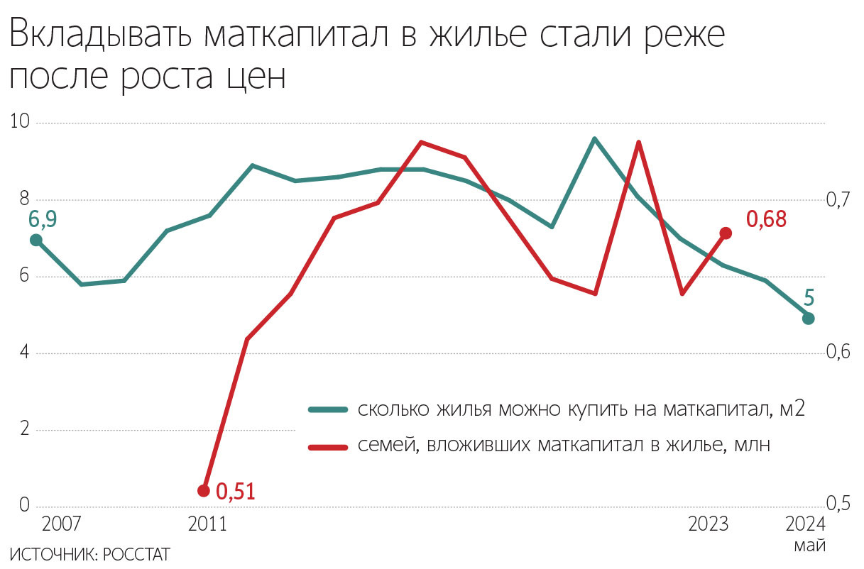 С 2007 г. в России, по данным на май 2024 г., 9,1 млн семей воспользовались средствами маткапитала для покупки или строительства жилья. По их заявлениям Социальный фонд перечислил 3,9 трлн руб. Но доля маткапитала в стоимости квартиры с середины 2010-х гг. постоянно снижалась, поскольку индексация этой меры господдержки не поспевала за ростом стоимости жилья. Особенно это касается больших городов, где жилье дороже, отмечает Александр Синельников.