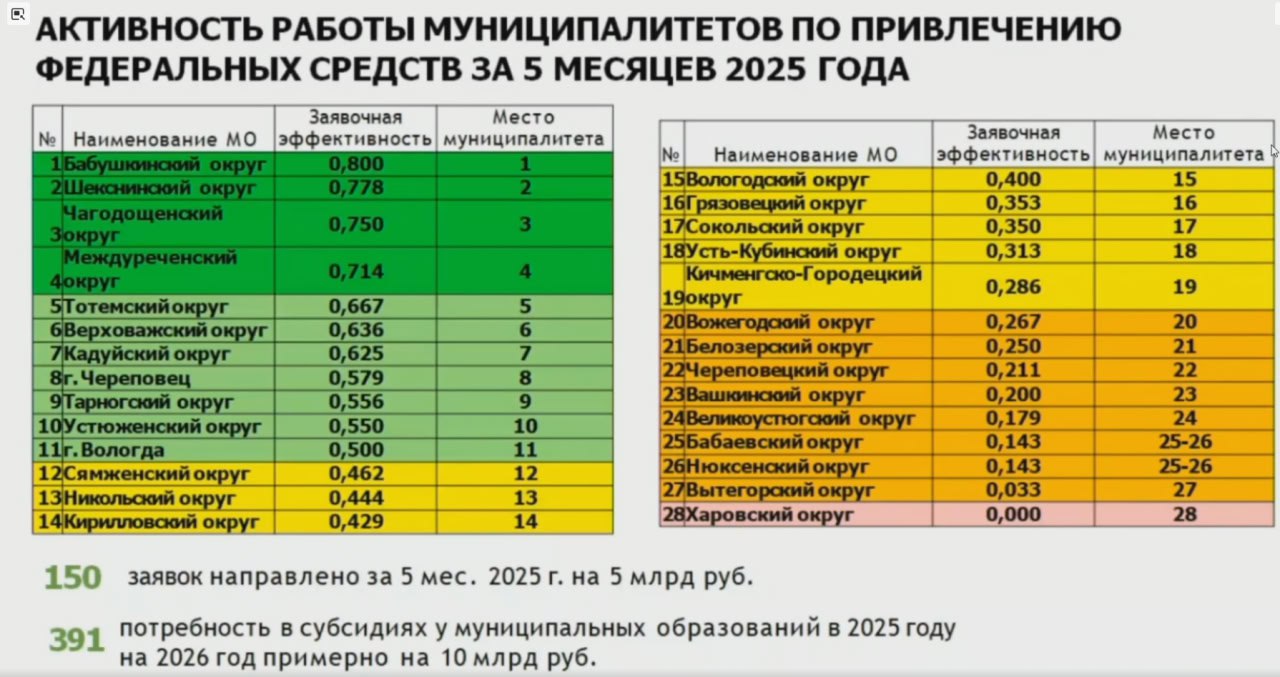Лучшие результаты показали главы Бабушкинского округа, Шекснинского округа, Чагодощенского округа и Междуреченского округа. На последнем месте оказался Харовский округ.