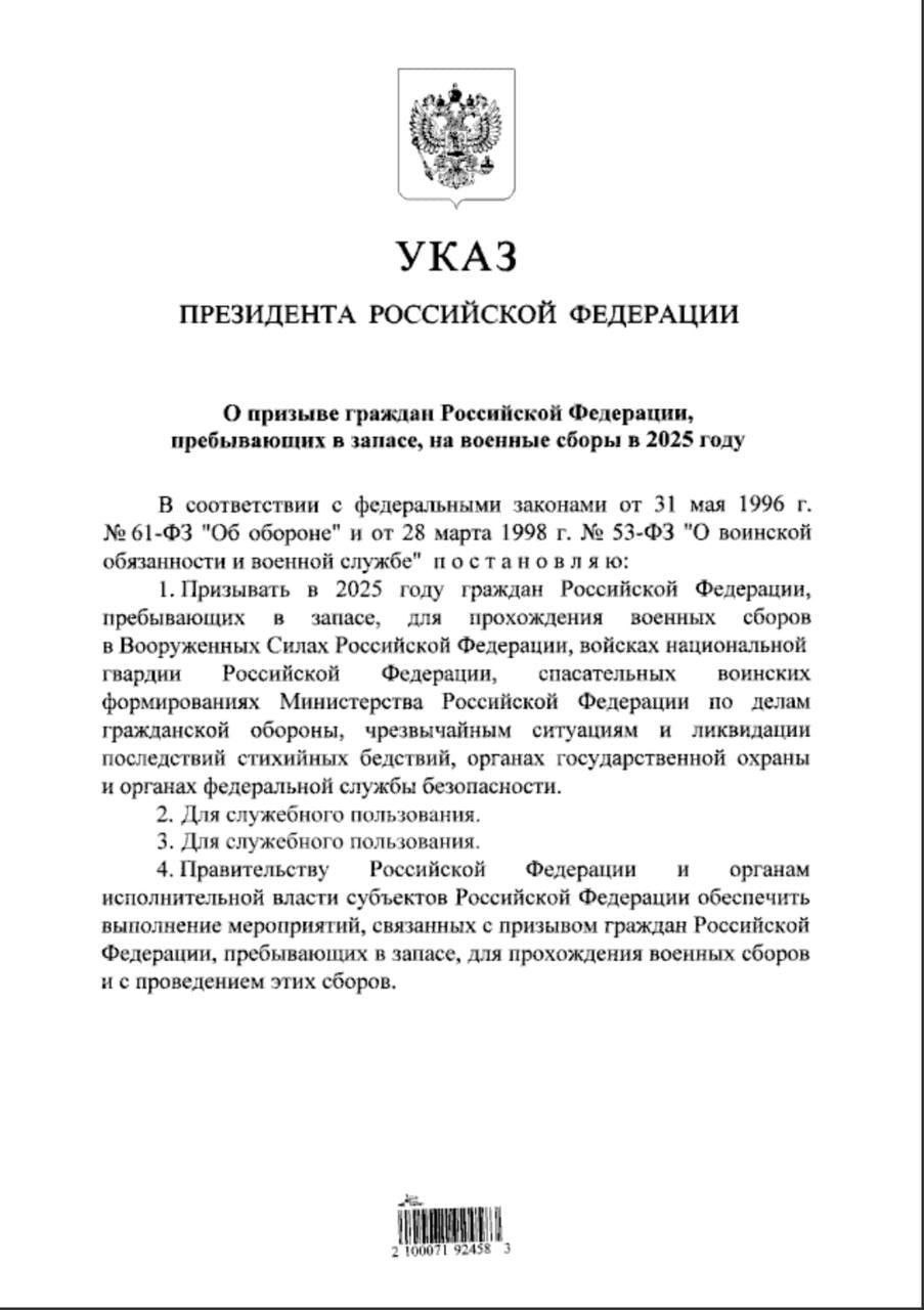 Президент России Владимир Путин подписал указ о призыве граждан, пребывающих в запасе, на плановые военные сборы в 2025 году.
