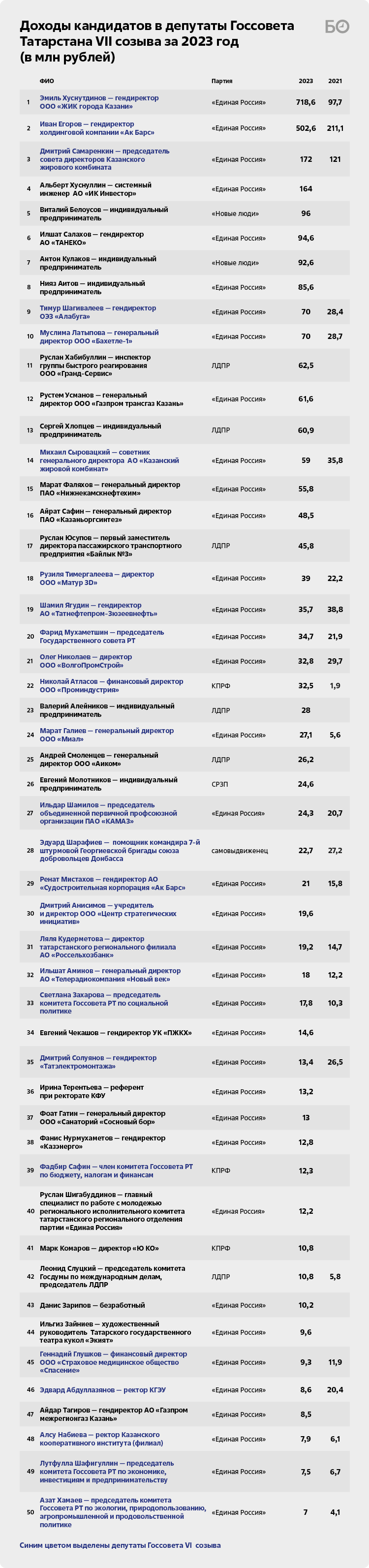 На втором месте генеральный директор АО «Холдинговая компания «Ак Барс» Иван Егоров. Он задекларировал доход в 502,6 млн рублей. За пять лет его достаток увеличился в 7 с лишним раз, а если сравнивать с 2021-м годом (211 млн рублей), то почти в 2,5 раза. Из отчета видно, что полумиллиардный доход был получен Егоровым от АО «Холдинговая компания «Ак Барс», ОАО «Казанский завод «Электроприбор, ООО «Финансовая корпорация «Тимерхан», а также от вкладов в «Ак барс Банке» и «Сбербанке». В самой компании в ответ на запрос издания подтвердили, что «доходы депутата Государственного Совета РТ Егорова Ивана Михайловича складываются из дохода по основному месту работы в АО «Холдинговая компания «Ак Барс», дохода от ценных бумаг и долей участия в коммерческих организациях (основная часть совокупного дохода)».