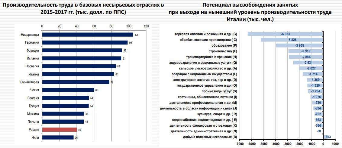 Если в России довести производительность труда до уровня Италии (не самой передовой страны в этом отношении), то на улицу придётся выбросить до 25 млн трудящихся, т.е. треть всех занятых.