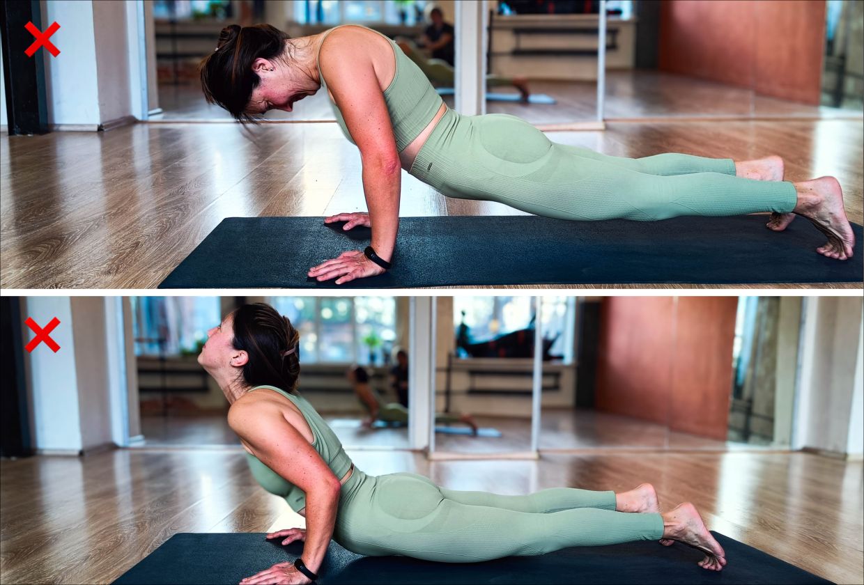 Далее обратите внимание на таз и поясницу. Тело должно оставаться прямой линией, избегайте прогиба в пояснице, провала в плечах или задирания таза наверх.