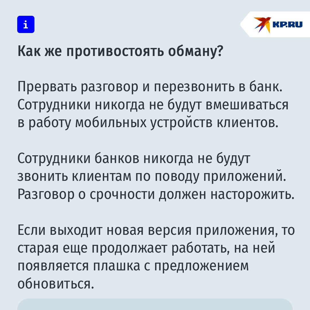 ΠΠΎΡΠ΅Π½Π½ΠΈΠΊΠΈ Π·Π²ΠΎΠ½ΡΡ ΠΏΠΎΡΠ΅Π½ΡΠΈΠ°Π»ΡΠ½ΠΎΠΉ ΠΆΠ΅ΡΡΠ²Π΅ ΠΈ ΠΏΡΠ΅Π΄ΡΡΠ°Π²Π»ΡΡΡΡΡ ΡΠΎΡΡΡΠ΄Π½ΠΈΠΊΠ°ΠΌΠΈ Π±Π°Π½ΠΊΠ°, ΡΠ±Π΅ΠΆΠ΄Π°Ρ Π² Π½Π΅ΠΎΠ±Ρ ΠΎΠ΄ΠΈΠΌΠΎΡΡΠΈ ΡΡΡΠ°Π½ΠΎΠ²ΠΈΡΡ "ΠΏΡΠ°Π²ΠΈΠ»ΡΠ½ΡΡ Π²Π΅ΡΡΠΈΡ" ΠΏΡΠΈΠ»ΠΎΠΆΠ΅Π½ΠΈΡ, ΠΈΠ½Π°ΡΠ΅ Π±Π°Π½ΠΊ ΡΠΊΠΎΠ±Ρ Π·Π°Π±Π»ΠΎΠΊΠΈΡΡΠ΅Ρ ΡΡΠ΅ΡΠ° ΠΈ ΠΊΠ°ΡΡΡ ΠΊΠ»ΠΈΠ΅Π½ΡΠ°. ΠΠΎΡΠ»Π΅ ΡΡΠΎΠ³ΠΎ ΠΆΠ΅ΡΡΠ²Π΅ ΠΏΡΠΈΡ ΠΎΠ΄ΠΈΡ ΡΡΡΠ»ΠΊΠ° Π΄Π»Ρ ΡΠΊΠ°ΡΠΈΠ²Π°Π½ΠΈΡ "ΠΊΠΎΡΡΠ΅ΠΊΡΠ½ΠΎΠ³ΠΎ" ΠΏΡΠΈΠ»ΠΎΠΆΠ΅Π½ΠΈΡ.