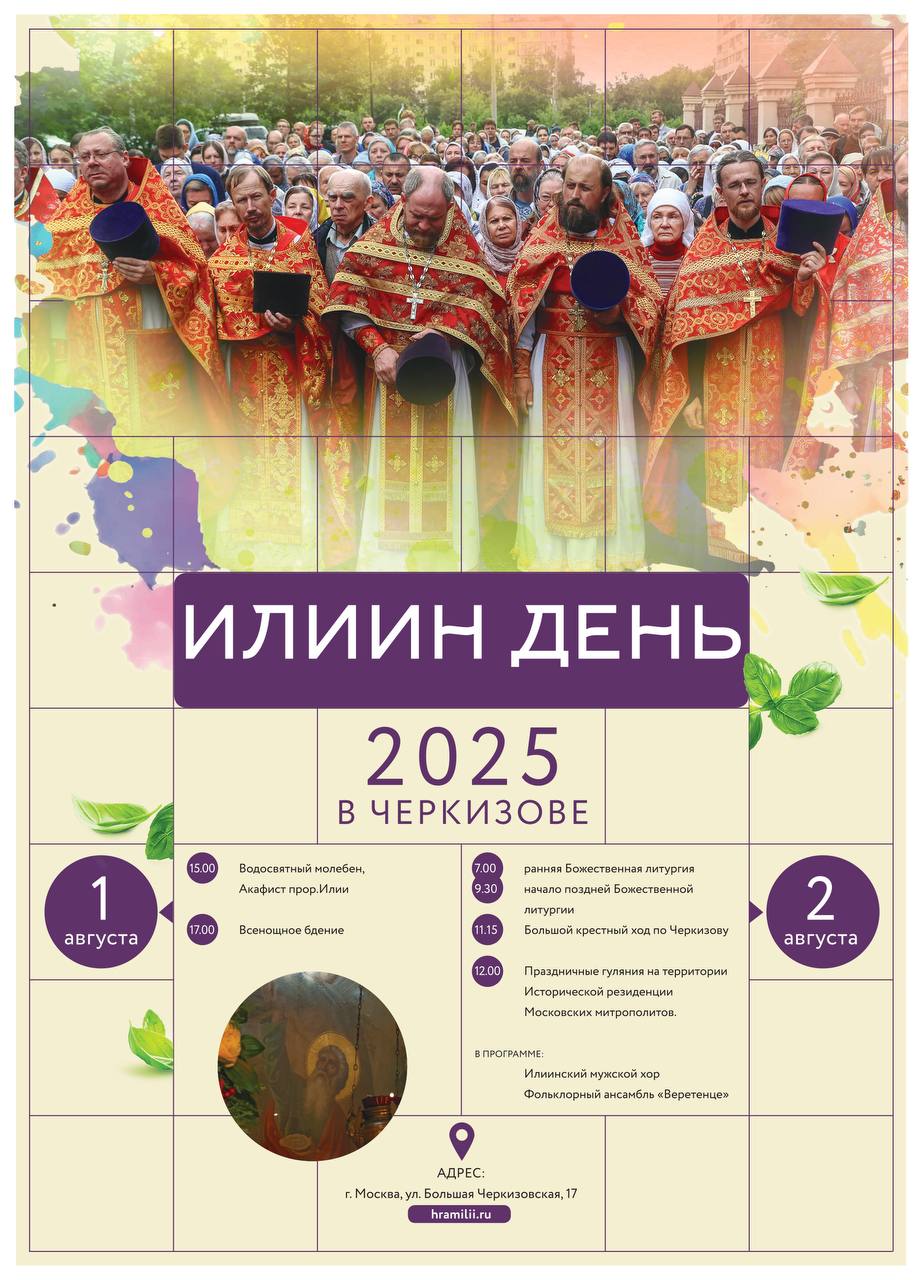 Для всех нас будни этой недели завершатся празднованием Илиина дня — славлением Господа и пророка Божия Илии. Начинаем по церковному обычаю накануне, 1 августа, пением акафиста пророку и служением всенощного бдения. В самый день праздника, 2 августа, ранняя литургия в 7.00, поздняя — в 9.30. После нее большой крестный ход по Черкизову и гуляния на территории исторической резиденции Московских митрополитов.