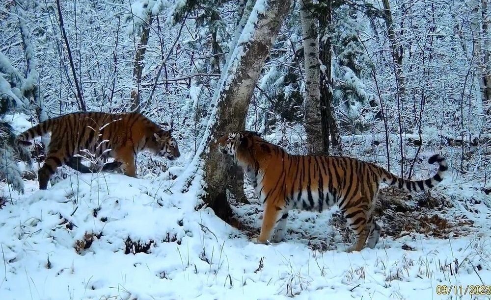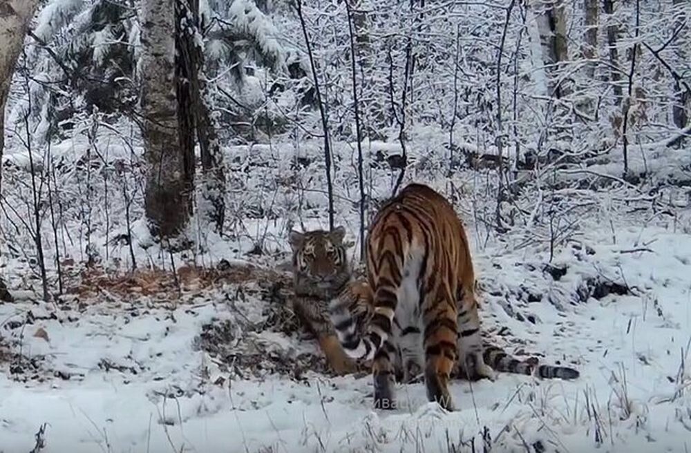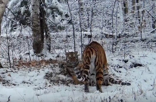 Фотоловушкиа в Сихотэ-Алинском заповеднике запечатлела тигрицу Принцессу и её детёныша. Животные радовались первому снегу и играли друг с другом.