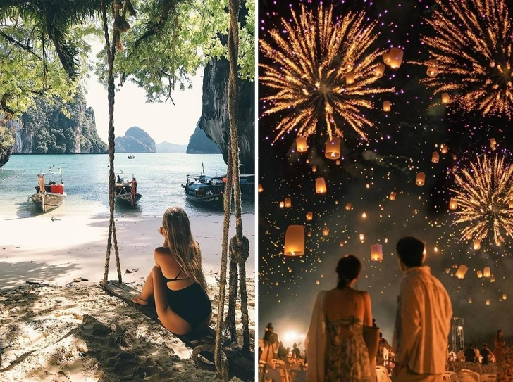 Новый год повсюду в Таиланде отмечают с размахом. Одна из традиций — пойти на берег моря, чтобы загадать желание и запустить в небо бумажный фонарик. Небо в огоньках от сотен и тысяч фонарей — незабываемое зрелище.
