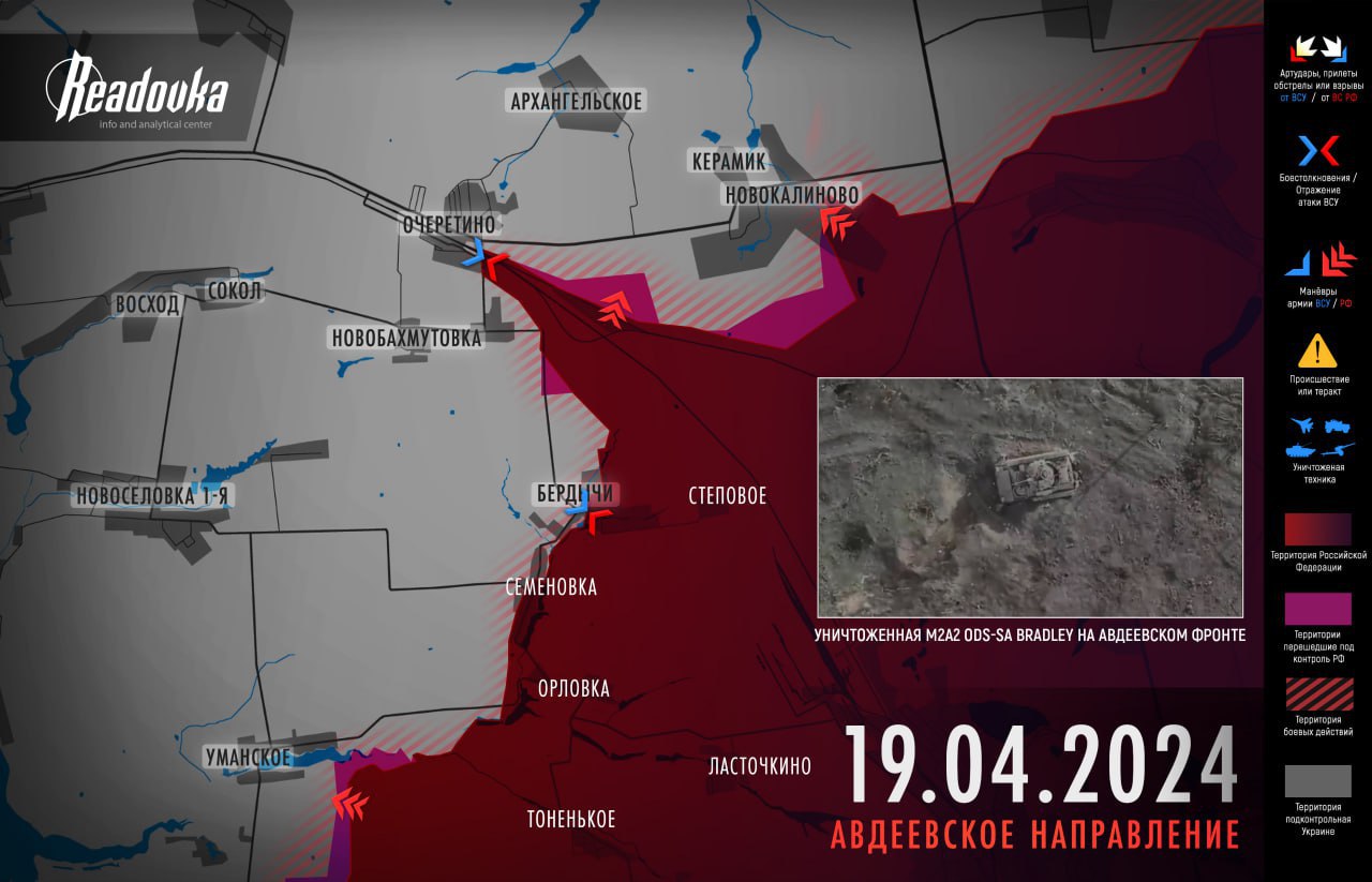 Наши бойцы закрепились в Очеретино и Новокалиново, обеспечив себе возможность для дальнейшего продвижения. В ответ на действия русской армии ВСУ бросили резервы для встречных боев, вынудив наши войска ослабить давление в районе Бердычей — сейчас ротацию украинских подразделений планомерно срывают удары российских тяжелых огнеметных систем. Суета и слабые попытки ВСУ противодействовать русской армии наблюдаются на всем Авдеевском направлении.