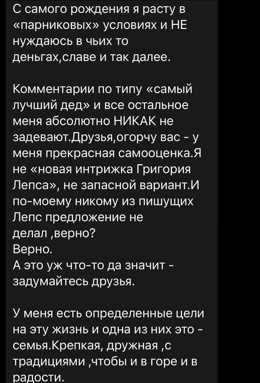 «С самого рождения расту в „парниковых“ условиях и не нуждаюсь в чьих-то деньгах, славе и так далее. Комментарии по типу „самый лучший дед“ и все остальное меня абсолютно никак не задевают. Друзья, огорчу вас — у меня прекрасная самооценка. Я не „новая интрижка Григория Лепса“, не запасной вариант. И, по-моему, никому из пишущих Лепс предложение не делал, верно? Верно. А это уже что-то да значит, задумайтесь, друзья», — написала Аврора.