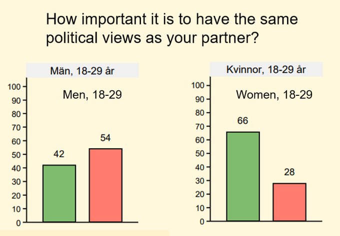 Большинству молодых женщин нужен парень, разделяющий их политические взгляды. Молодые мужчины менее требовательны в этом отношении к женщинам.