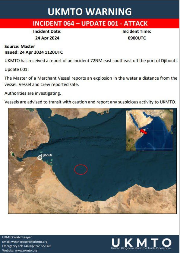 Первый за последние 3 недели инцидент в "зоне ответственности" хуситов - нападение на судно у берегов Джибути, зафиксирован взрыв в воде.