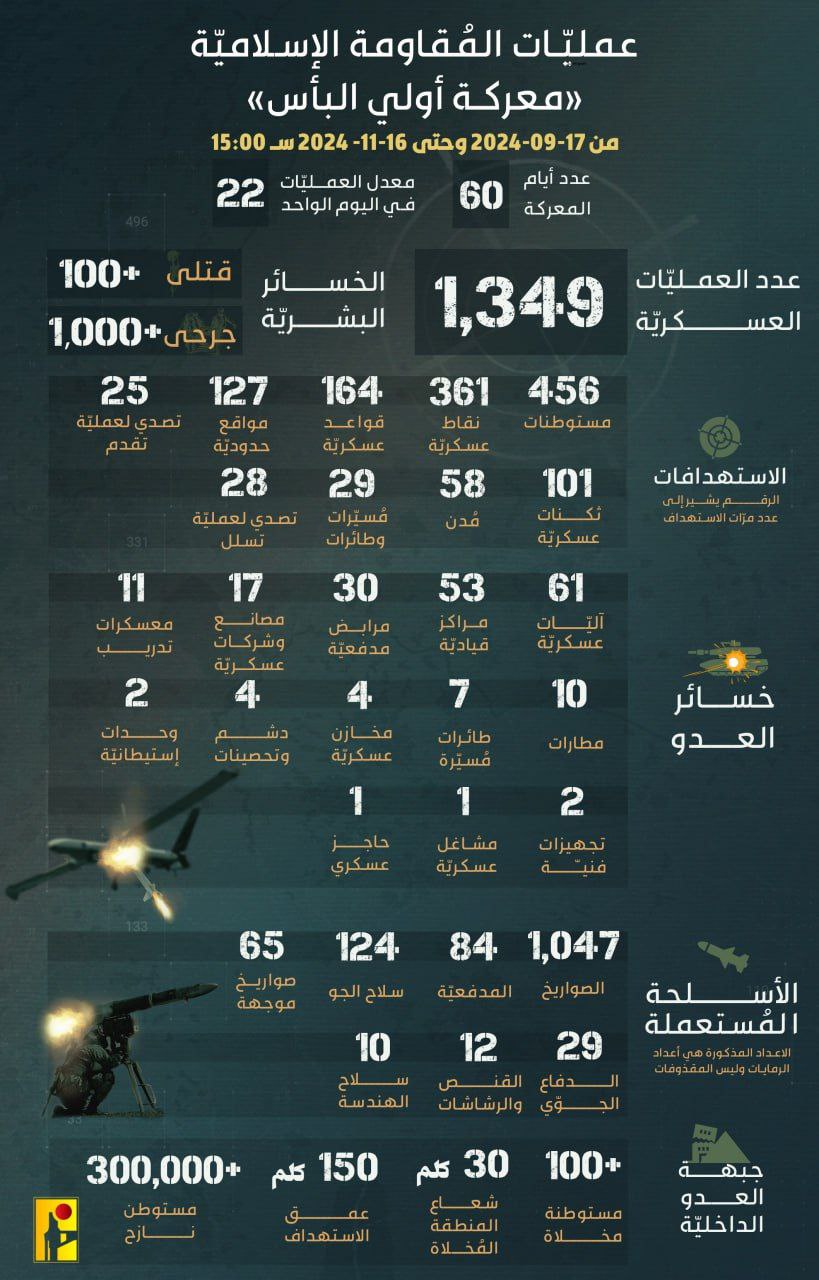 Группировка утверждает, что погибло более 100 израильских солдат. 11 израильских тренировочных лагерей, 30 артиллерийских позиций и 53 командных центра были, как утверждается, уничтожены за последние два месяца в ходе конфликта.
