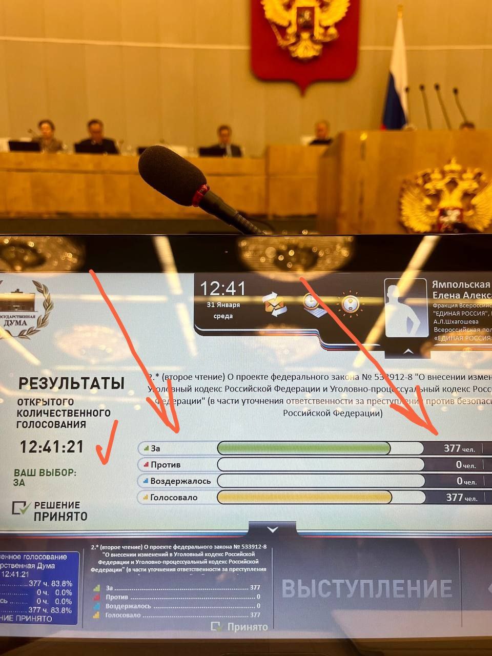 Это коллективная инициатива — авторами закона числятся 395 депутатов. Однако на его принятии в первом-втором чтении против проголосовали 3 депутата. Среди них журналист и писатель Сергей Шаргунов, пишет в своём в телеграм-канале учёный и блогер Дмитрий Конаныхин. Сегодня закон принят единогласно, но ряды голосовавших заметно поредели — только 377 депутатов.