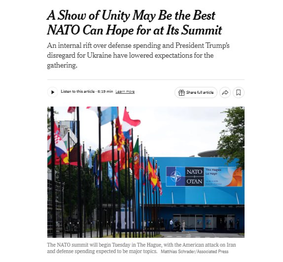 New York Times: Внутренние расхождения во мнениях по поводу расходов на оборону в альянсе и пренебрежительное отношение Трампа к Украине снизили ожидания от встречи в Гааге.