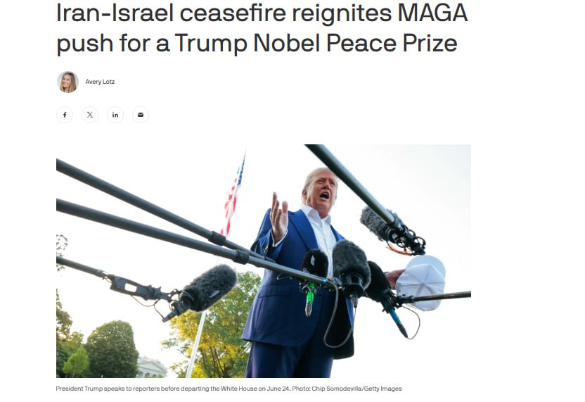 Axios: Хрупкое перемирие между Ираном и Израилем может стать поводом для погони Трампа за одной из его навязчивых идей - Нобелевской премией мира.
