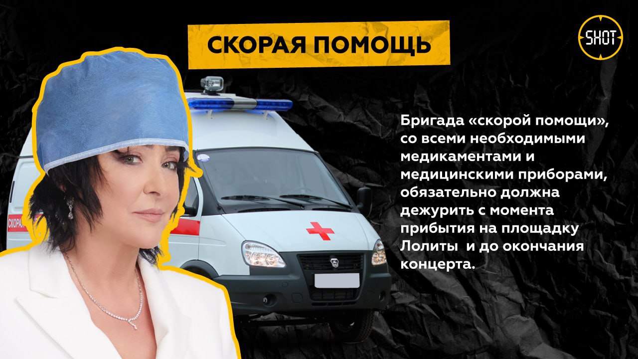 На каждом мероприятии певица просит организовать присутствие скорой помощи и полиции. 61-летняя артистка готова выплясывать, только если рядышком будет дежурить неотложка, а охранять её будут сотрудники МВД или лицензированное ЧОП. Цветы на сцену разрешает выносить только по команде — после песни «Пошлю его на».