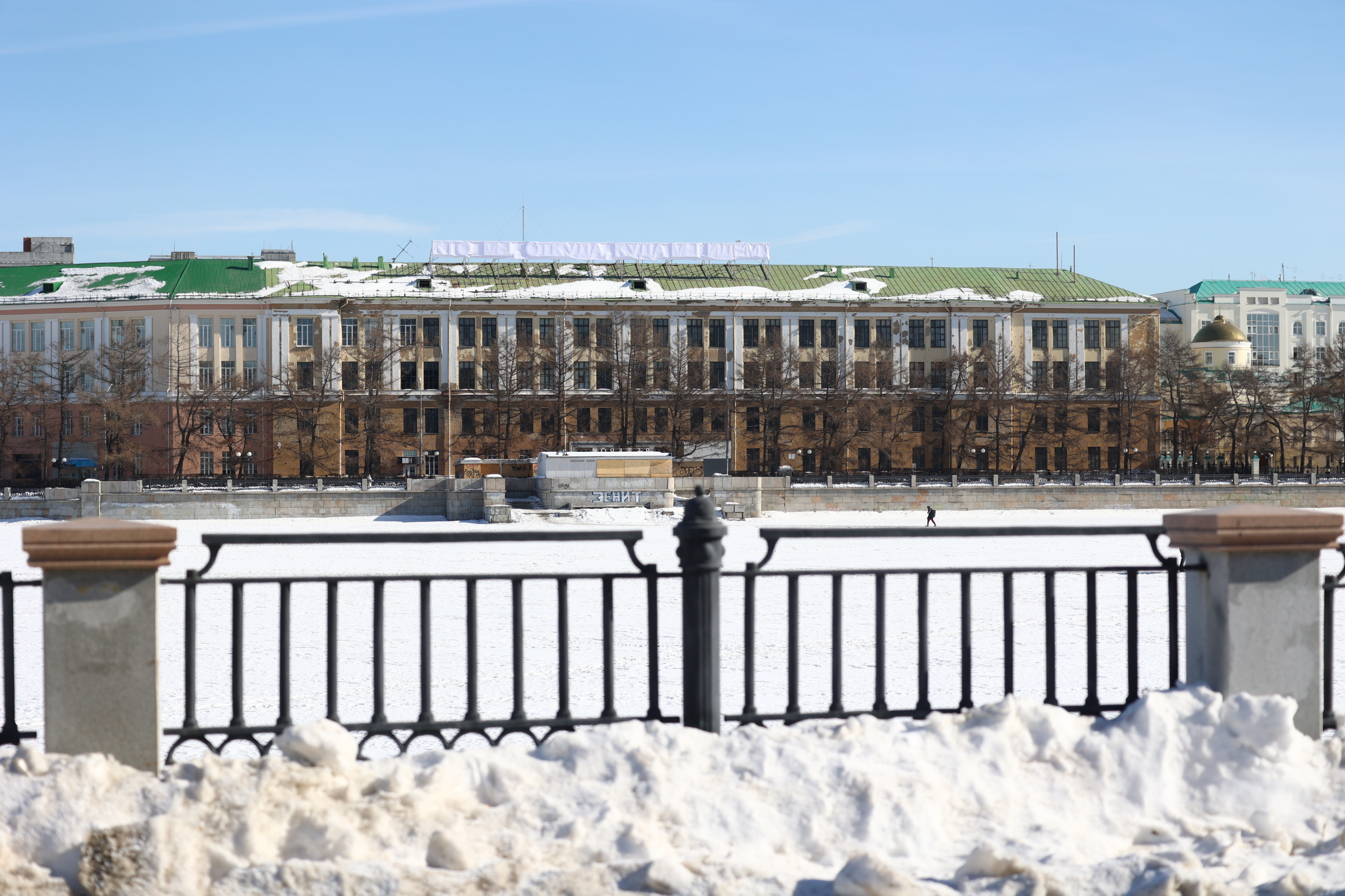 На Плотинке на крыше Приборостроительного завода закрыли полотном надпись «Кто мы? Откуда? Куда мы идем?». Здание на Горького, 17 принадлежит УГМК, компании разрешили снос части завода еще в 2020 году. Четырехэтажный корпус решили демонтировать ради строительства храма.
