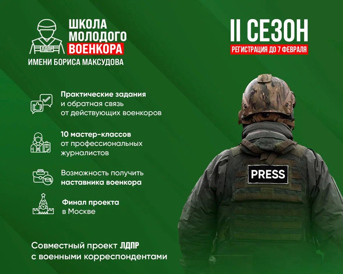 Второй сезон проекта «Школа молодого военкора имени Бориса Максудова» — это продолжение совместного проекта ЛДПР с военными корреспондентами, который направлен на то, чтобы показать работу журналиста изнутри и раскрыть важность работы с информацией, научить выявлять фейки и апеллировать фактами.