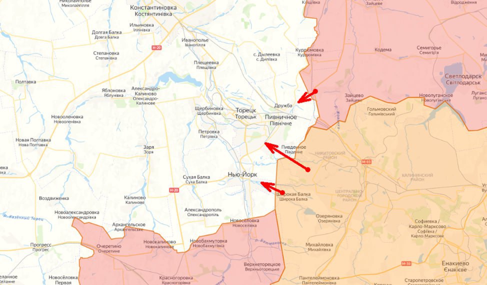 «Поступают сообщения, что российские войска зашли на южную окраину Нью-Йорка. Этот посёлок находится в 6 км к западу от Горловки и длительное время используется ВСУ как мощный укрепрайон. Нью-Йорк расположен в низине и, предположительно, является наиболее удобной точкой входа для дальнейшего развития атаки на Нелеповку и последующим возможным выходом на Торецк, а оттуда — к трассе Н-32 на Константиновку под Часовым Яром»