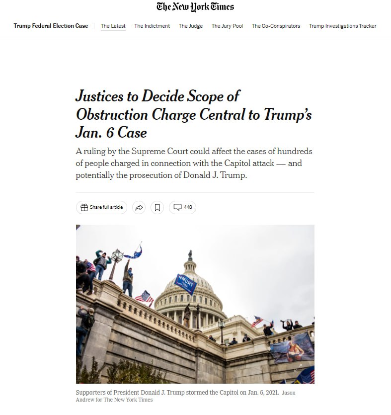 В среду Верховный суд согласился рассмотреть дело, которое может перевернуть судебное преследование сотен участников беспорядков, штурмовавших Капитолий 6 января 2021 года, и отложить — или ограничить масштабы — судебный процесс над бывшим президентом Дональдом Трампом по федеральным обвинениям в пытаясь отменить свое поражение на выборах.