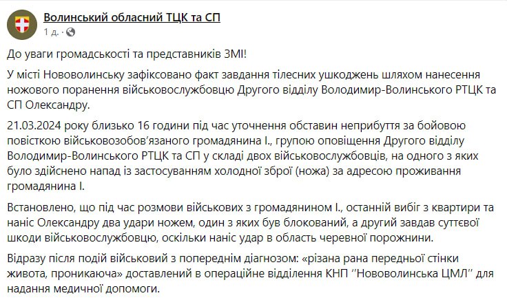 На Волыни мужчина напал с ножом на военкомов во время вручения повестки, — Волынский областной ТЦК и СП