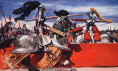 Напротив, другое обличие позднесредневековых турниров — престижные поединки с боевым оружием, существующие на периферии обычной военной активности. Таковы нашумевшие в свое время поединки близ Кале, в марте-апреле 1390 года, когда французские рыцари Бусико, Рено де Руа и сир де Санпи в течение месяца сражались со всеми желающими.