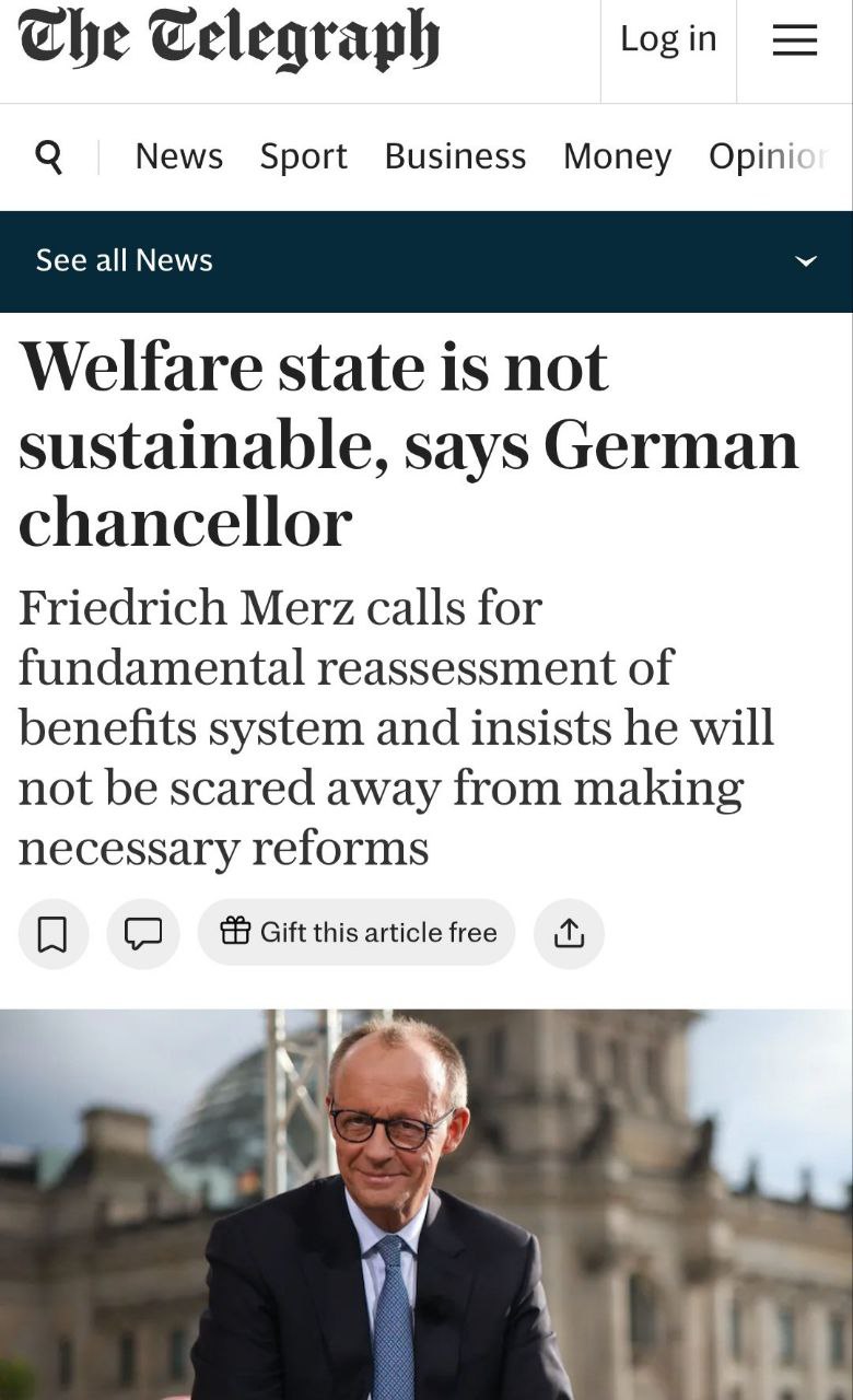 Вчера канцлер Германии Мерц сообщил: «Государство всеобщего благосостояния в том виде, в котором оно есть сегодня, больше не может финансироваться за счет того, что мы можем себе позволить экономически». @banksta