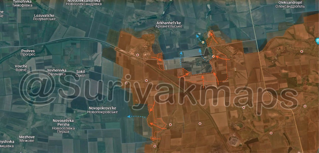 2. Ситуация к северу и западу от Авдеевки: Российская армия завершила освобождение н.п. Бердычи. С другой стороны, российские войска взяли под свой контроль новые позиции к востоку от Очеретино. В Новокалиново российские войска продвинулись в центральную часть поселка и вынудили украинскую армию отойти на север. Также параллельно зачистке Новокалиново идет штурм н.п. Керамик.