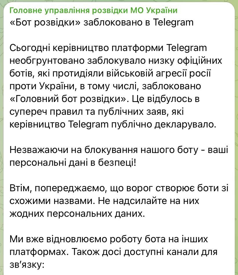 "Сегодня руководство платформы Telegram необоснованно заблокировало ряд официальных ботов, которые противодействовали военной агрессии России против Украины, в том числе, заблокирован "Главный бот разведки". Это произошло в противоречие правилам и публичным заявлениям, которые руководство Telegram публично декларировало".