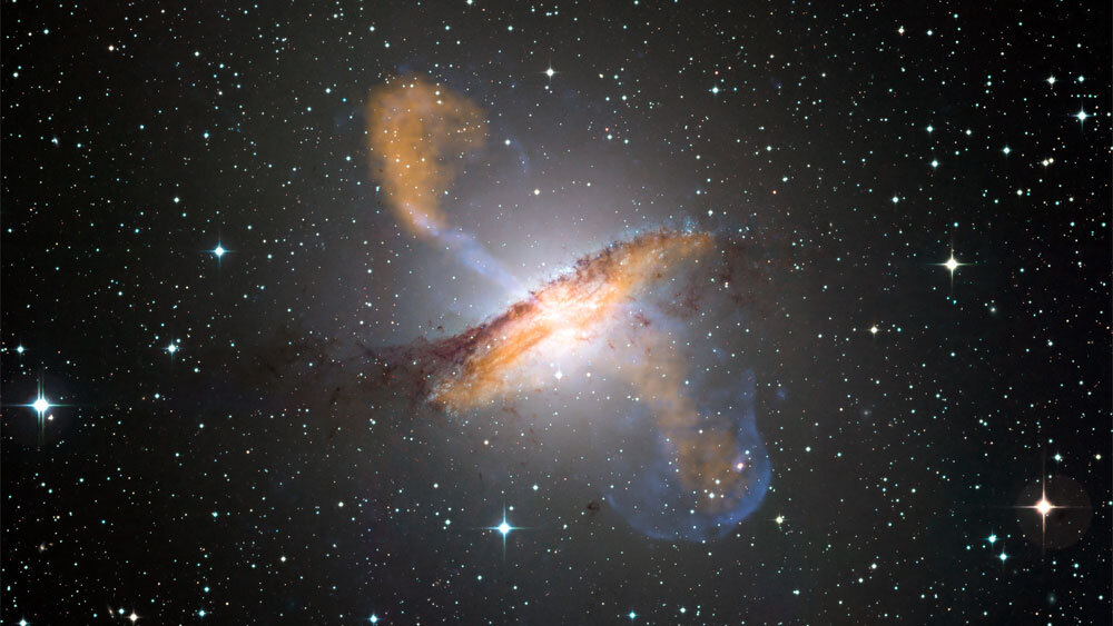 Частицы высокой энергии вылетают не из самой Cen A, а из ее окрестностей, порожденные мощными магнитными и гравитационными полями, в виде струи. Она простирается на 30 тысяч световых лет и движется с околосветовой скоростью. В одном месте, словно споткнувшись, она делает V-образный изгиб.