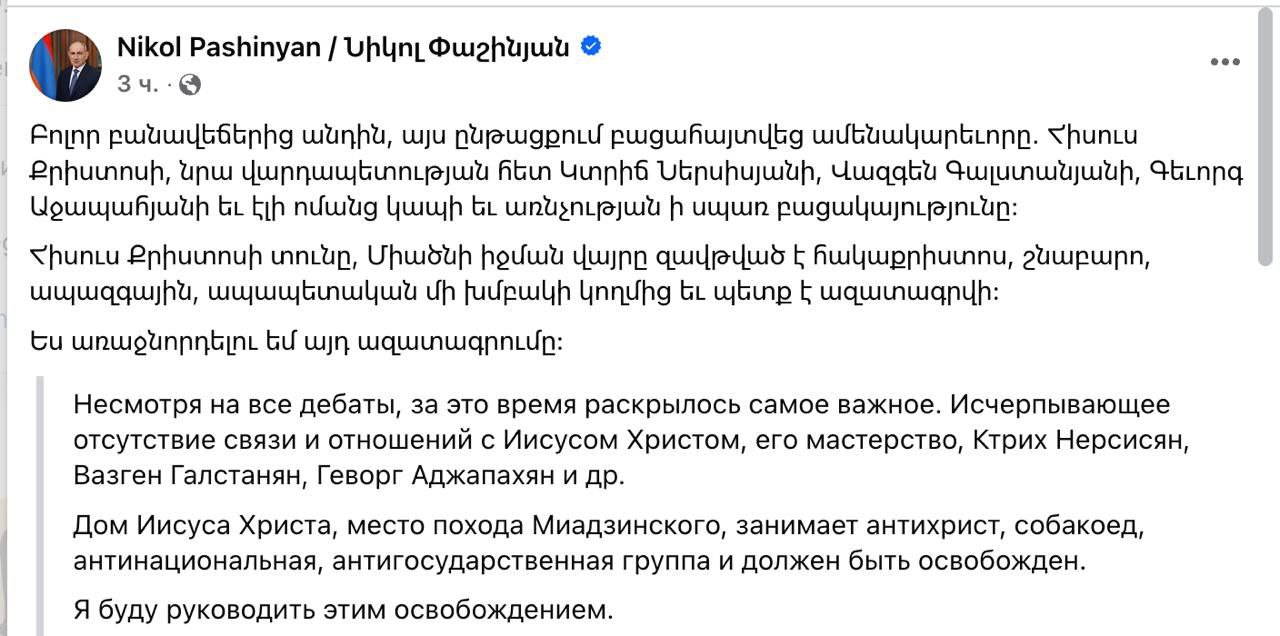 Пашинян объявил, что «возглавит освобождение» Армянской апостольской церкви от «антихриста». Премьер Армении считает, что у ее руководителей «нет связи с Иисусом Христом»: «За пределами всех дебатов за это время было выявлено самое главное: полное отсутствие связи и соприкосновения Ктрича Нерсисиана (католикос — Ред.), Вазгена Галстаняна, Геворга Аджапахьяна и некоторых других с Иисусом Христом и Его учением. Дом Иисуса Христа, место нисхождения Единородного (Миадзина), захвачен антихристом, собаковедом, развратной, антинациональной, антигосударственной группировкой и должен быть освобождён. Я буду возглавлять это освобождение», — написал премьер Армении. Платформа X (ru)|Платформa Х (eng)|BlueSky|WhatsApp