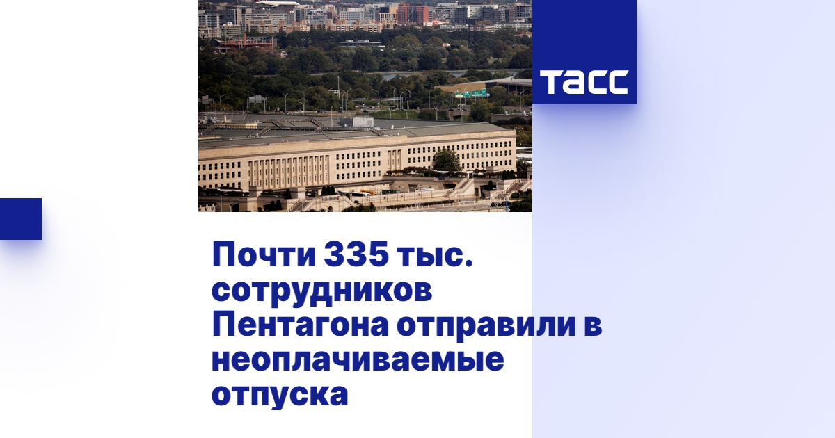 ВАШИНГТОН, 2 октября. /ТАСС/. Руководство Пентагона отправило в неоплачиваемые отпуска 334 904 человека, или почти половину своих гражданских сотрудников, из-за нынешней частичной приостановки работы правительства США ввиду отсутствия бюджетного финансирования (шатдаун). Об этом говорится в опубликованном документе военного министерства.